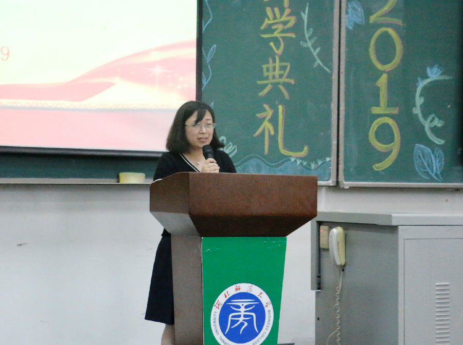 教师代表王艳芳老师对新生提出了几点期待。她希望2019级的新生能够努力努力再努力、学习学习再学习,在大学找到归属感,学会爱祖国、爱上学习,不要沉溺游戏,多走进图书馆、走进教室,在太阳集团度过充实、丰富、美好的大学生活。